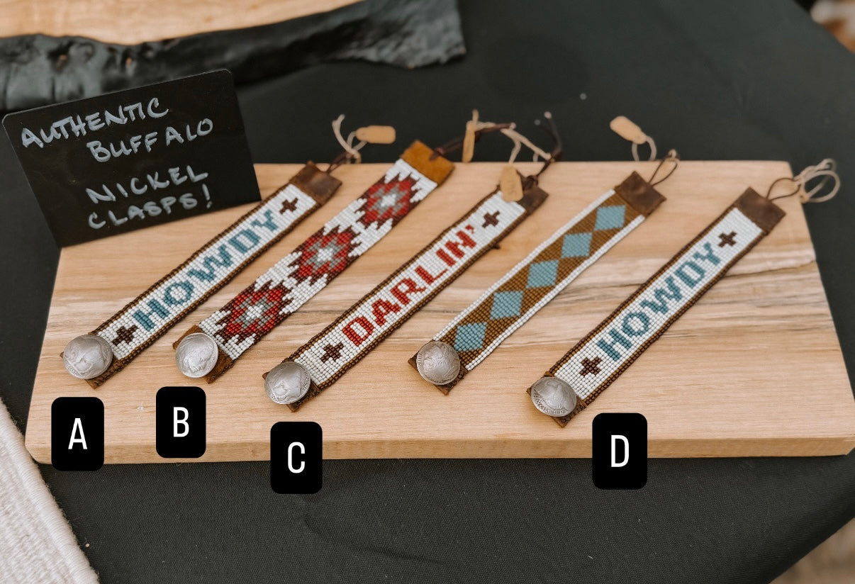 Authentic 1930’s buffalo nickel button and leather closure on handwoven beaded bracelets. Measurements below
