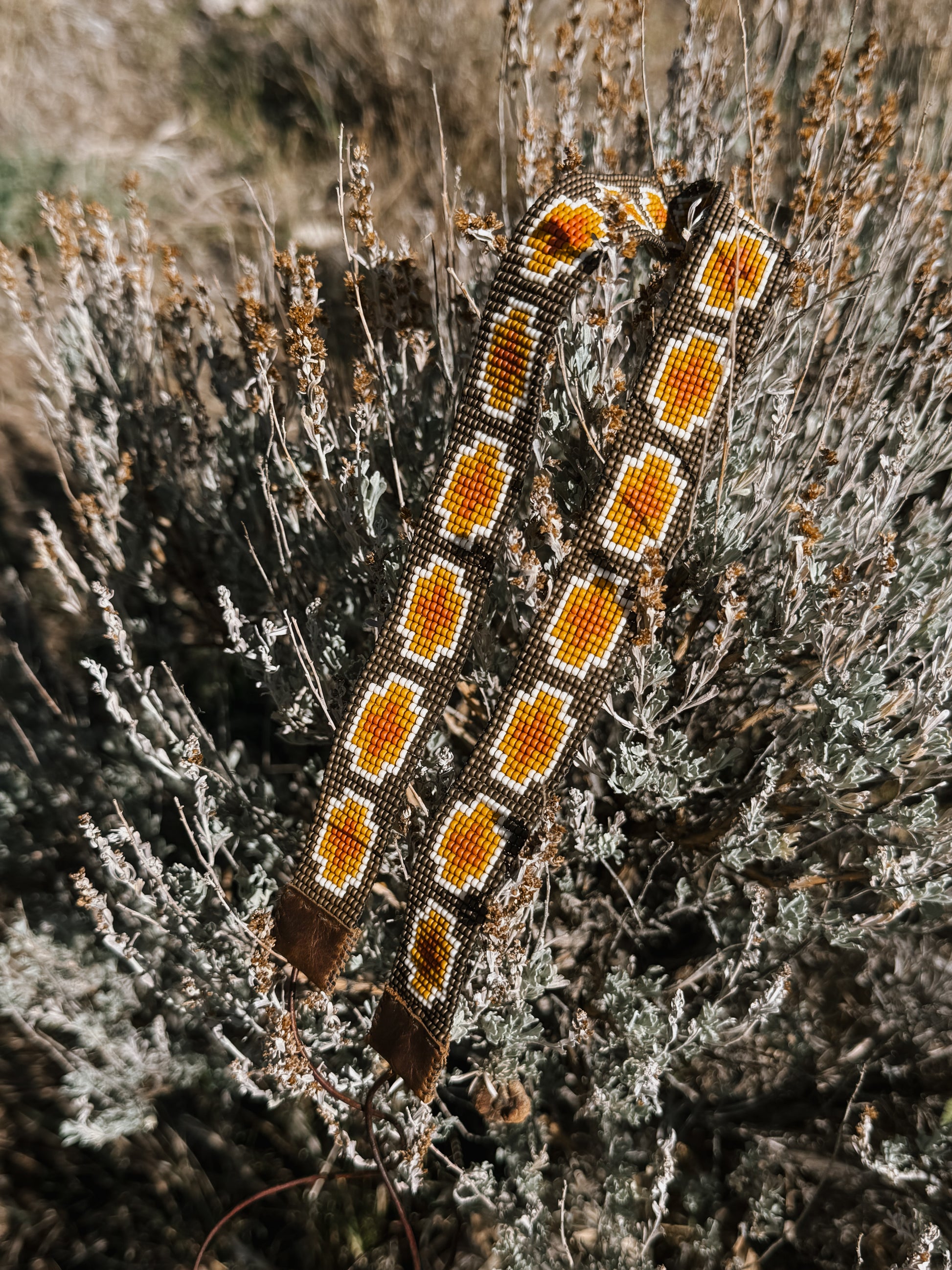Bronze, cream, terracotta, and mustard matte beads in a western cross pattern finished with leather ties for an adjustable length.